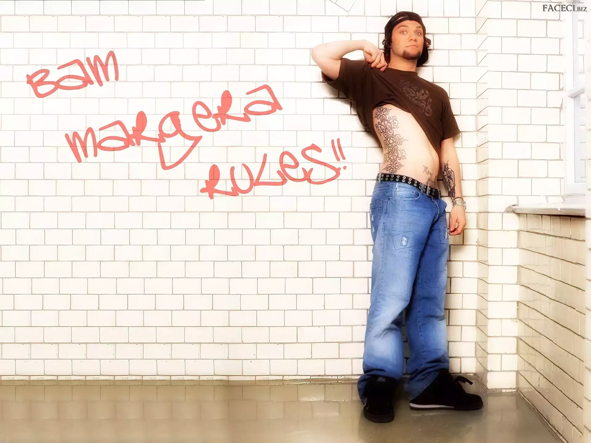 zegarek, Bam Margera, deskorolka kurtka, Bam Margera, rozpięta okulary, Bam Margera, butelka okulary, Bam Margera, twarze t-shirt, Bam Margera, brązowy włosy, Bam Margera, ciemne